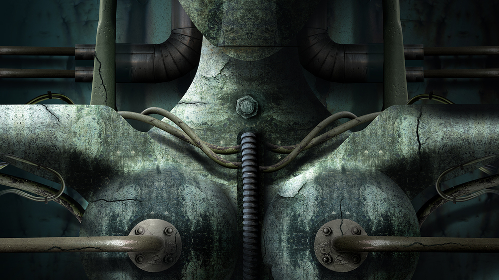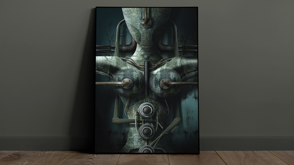 Dark, moody, and mechanical composite digital art illustration. Be bold and darken your space with this unique poster, perfect for any room in your home or office! Available as a large-size (24x36) printable wall art.